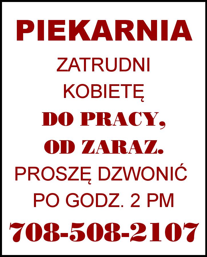 PIEKARNIA ZATRUDNI KOBIETĘ DO PRACY. OD ZARAZ. PROSZĘ DZWONIĆ PO GODZ. 2 PM 708-508-2107