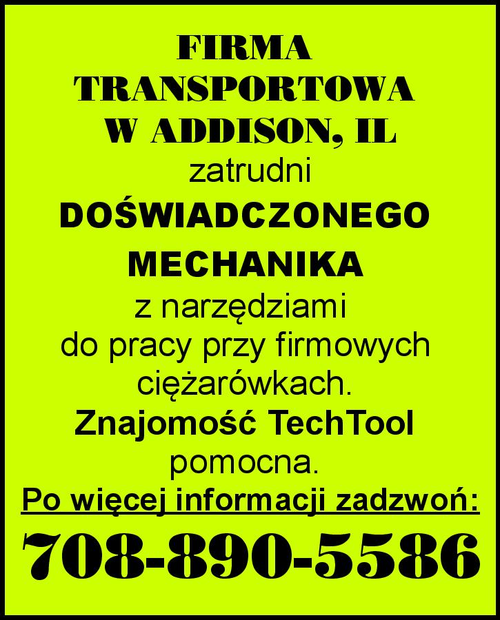 FIRMA TRANSPORTOWA W ADDISON, IL zatrudni DOŚWIADCZONEGO MECHANIKA z narzędziami do pracy przy firmowych ciężarówkach. Znajomość TechTool pomocna. Po więcej informacji zadzwoń: 708-890-5586
