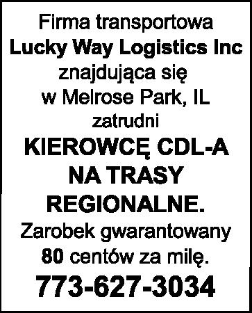 Firma transportowa Lucky Way Logistics Inc znajdująca się w Melrose Park, IL zatrudni KIEROWCĘ CDL-A NA TRASY REGIONALNE. Zarobek gwarantowany 80 centów za milę 773-627-3034