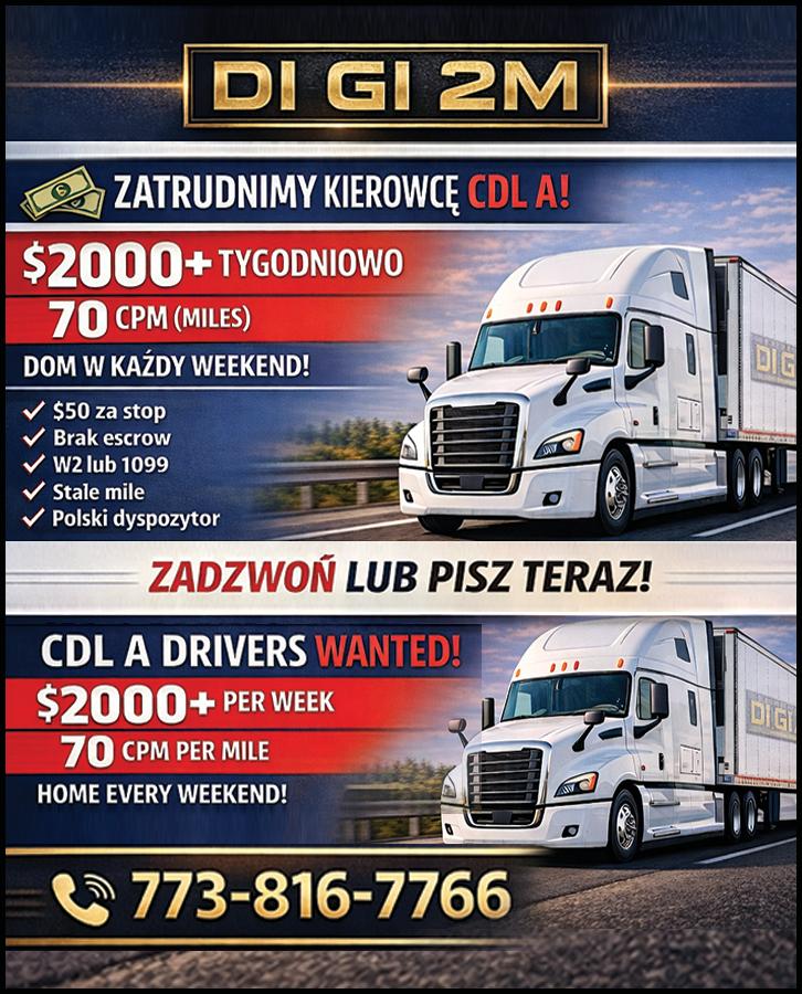 DI GI 2M ZATRUDNIMY KIEROWCĘ CDL A! $2000+ tygodniowo 70 CMP (miles) W domu w każdy weekend - $50 za stop - brak escrow - W2 lub 1099 - stałe mile - polski dystrybutor ZADZWOŃ LUB PISZ TREAZ! CDL A DRIVERS WANTED! $2000+ per week 70 CMP per mile Home every weekend! 773-816-7766