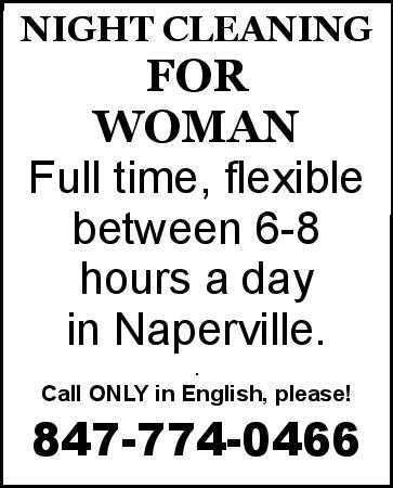Full time, flexible between 6-8 hours a day in Naperville. Call only in English, please! 847-774-0466