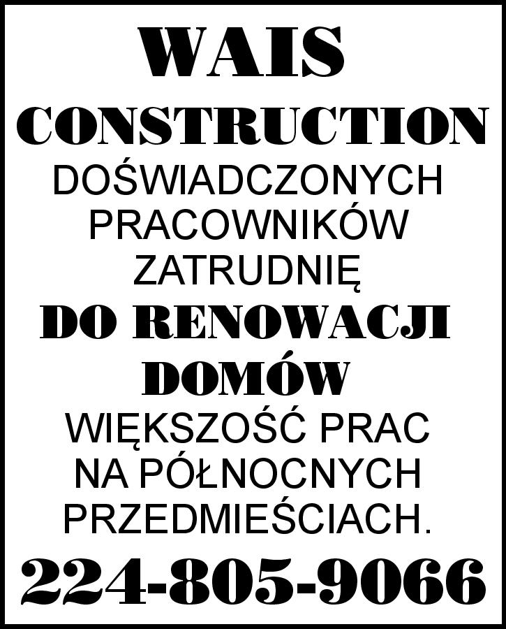 WAIS CONSTRUCTION DOŚWIADCZONYCH PRACOWNIKÓW ZATRUDNIĘ DO RENOWACJI DOMÓW. WIĘKSZOŚĆ PRAC NA PÓŁNOCNYCH PRZEDMIEŚCIACH. 224-805-9066