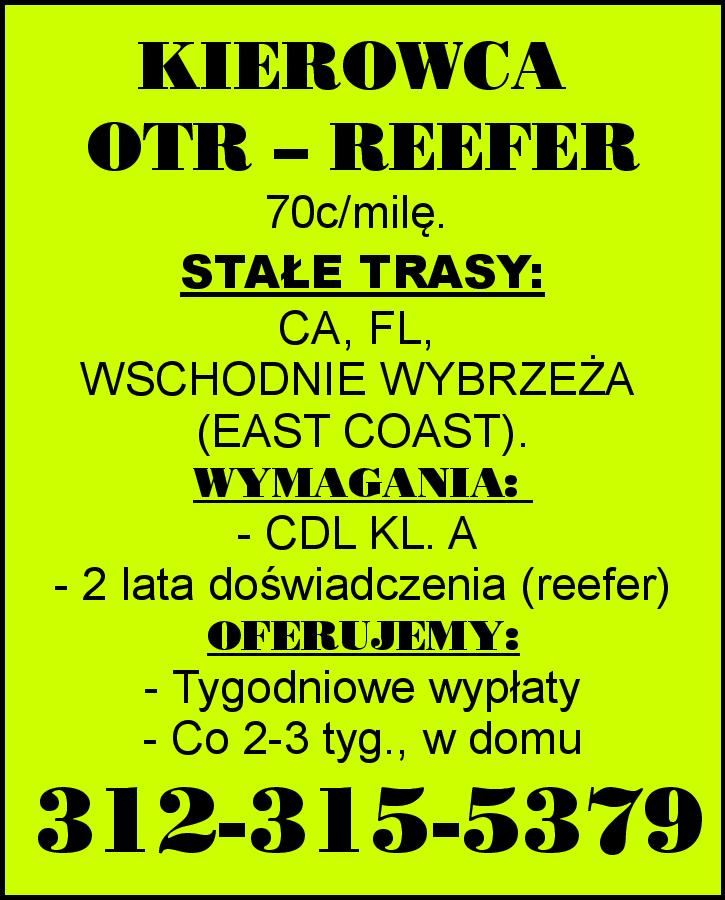 KIEROWCA OTR – REEFER 70c/milę. STAŁE TRASY: CA, FL, WSCHODNIE WYBRZEŻA (EAST COAST) WYMAGANIA: - CDL KL. A - 2 lata doświadczenia (reefer) OFERUJEMY: - Tygodniowe wypłaty - Co 2-3 tyg. w domu 312-315-5379