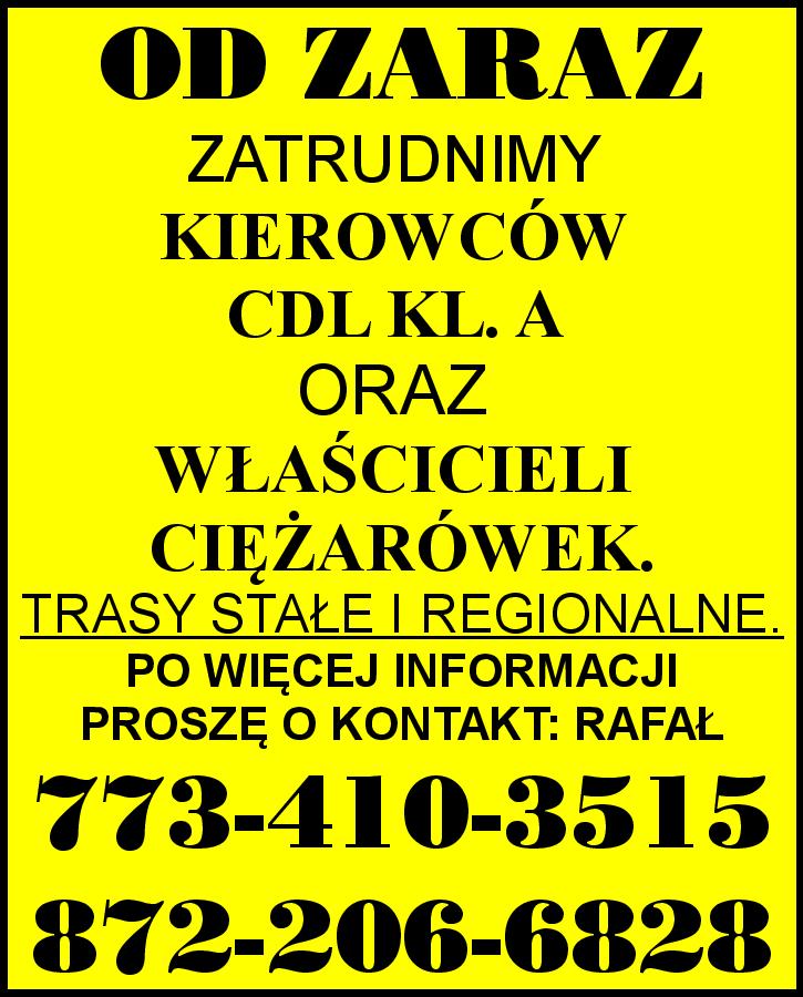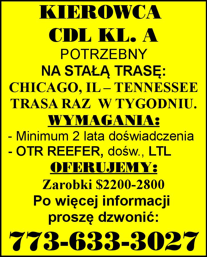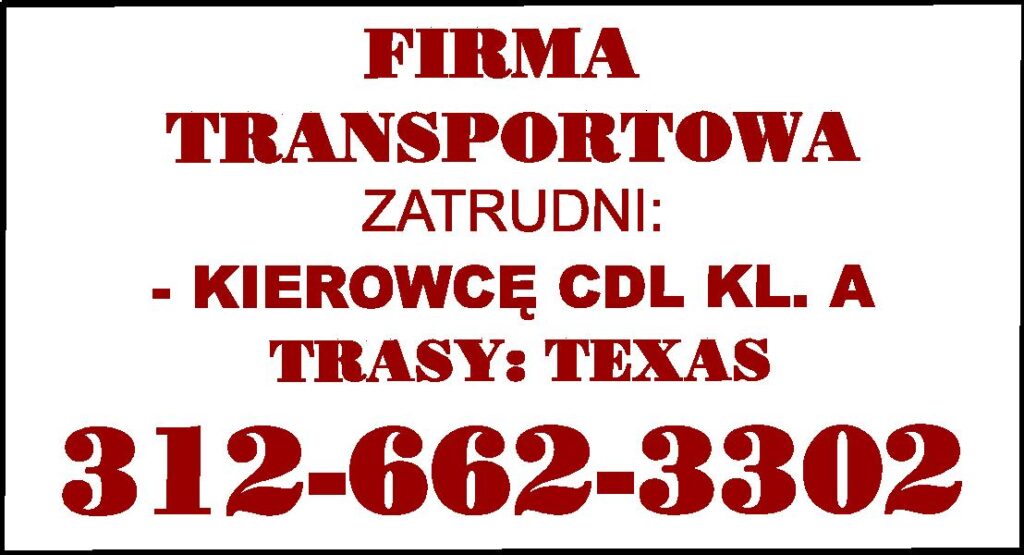 DOBRZE PROSPERUJĄCA FIRMA TRANSPORTOWA ZATRUDNI KIEROWCÓW CDL KL. A TRASY: CHICAGO - TEXAS HOUSTON - DALLAS - TEXAS PROSZĘ DZWONIĆ: 847-361-6870