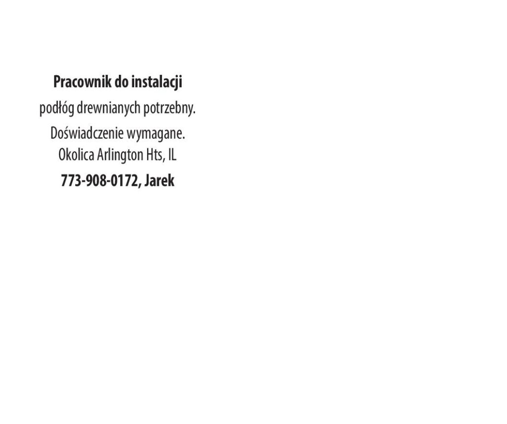 Pracownik do instalacji podłóg drewnianych potrzebny. Doświadczenie wymagane. Okolica Arlington Hts, IL 773-908-0172, Jarek