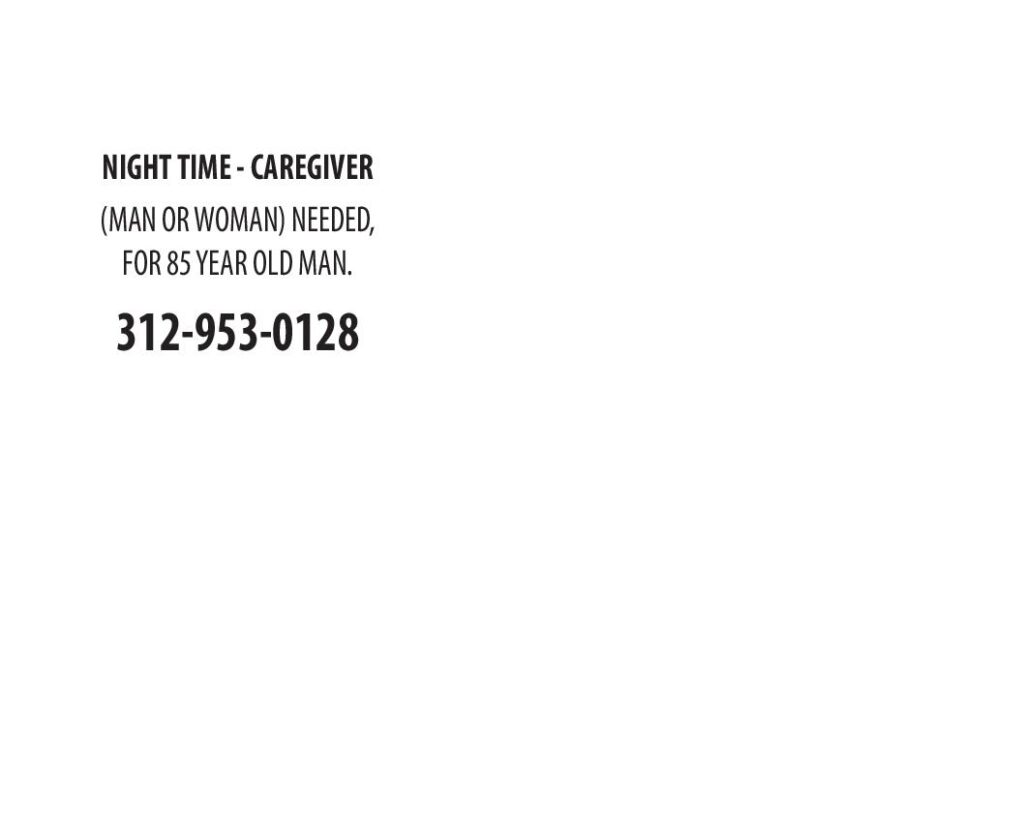 NIGHT TIME - CAREGIVER (MAN OR WOMAN) NEEDED, FOR 85 YEAR OLD MAN. 312-953-0128