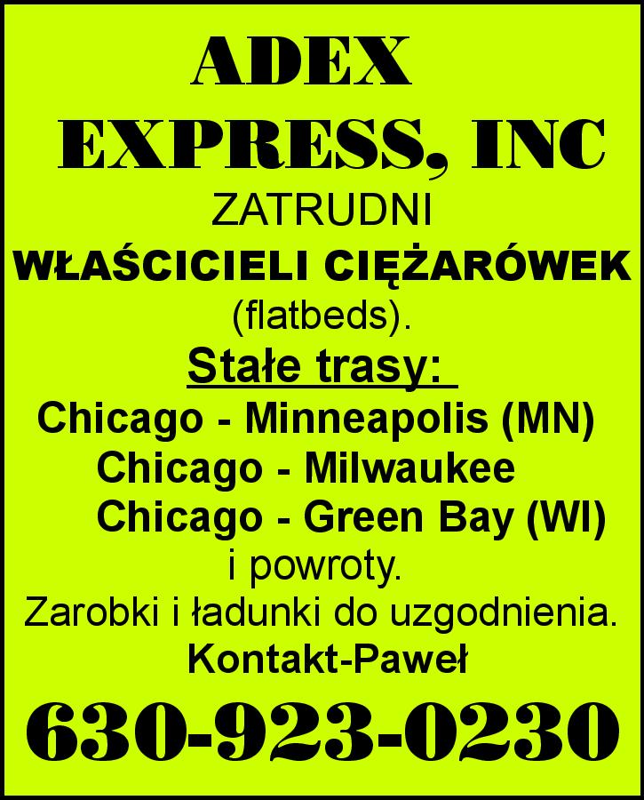 ADEX EXPRESS, INC zatrudni właścicieli ciężarówek (flatbeds). Stałe trasy: Chicago - Minneapolis (MN) Chicago - Milwaukee Chicago - Green Bay (WI) i powroty. Zarobki i ładunki do uzgodnienia. Kontakt Paweł 630-923-0230