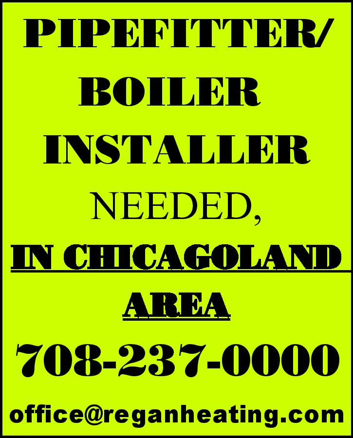 PIPEFITTER/BOILER INSTALLER NEEDED, IN CHICAGOLAND AREA 708-237-0000 [email protected]