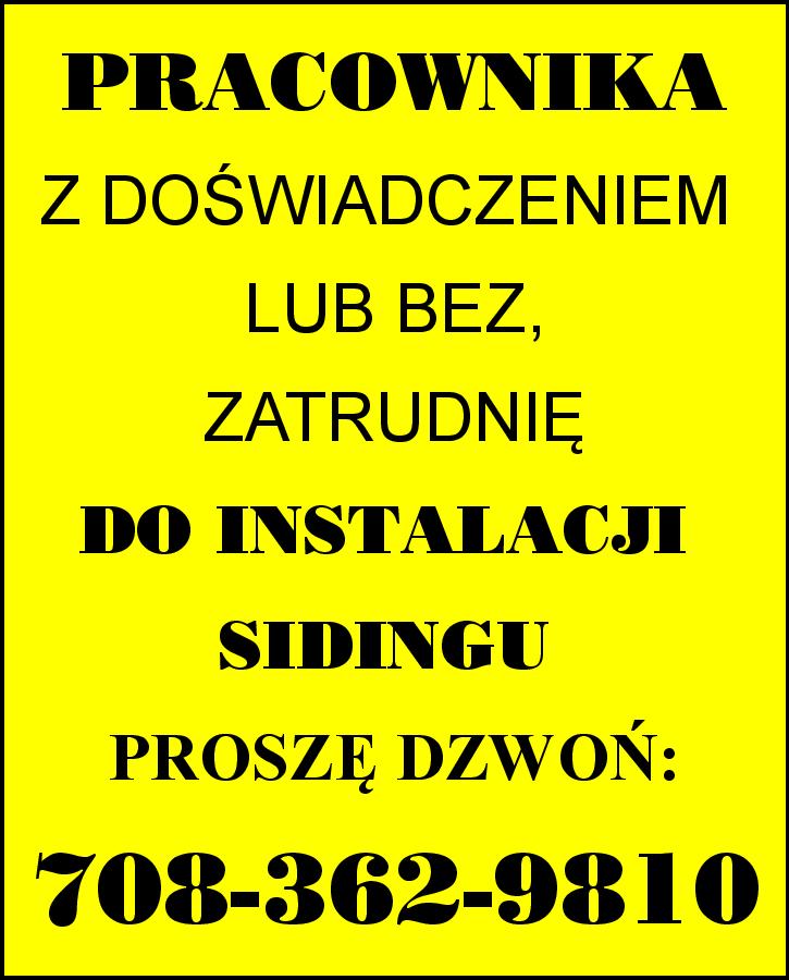 PRACOWNIKA Z DOŚWIADCZENIEM LUB BEZ, ZATRUDNIĘ DO INSTALACJI SIDINGU. PROSZĘ DZWOŃ: 708-362-9810