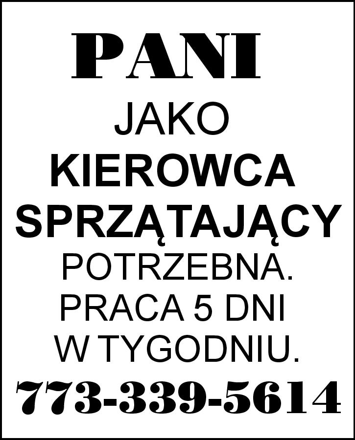 PANI JAKO PANI POTRZEBNA. PRACA 5 DNI W TYGODNIU. 773-339-5614