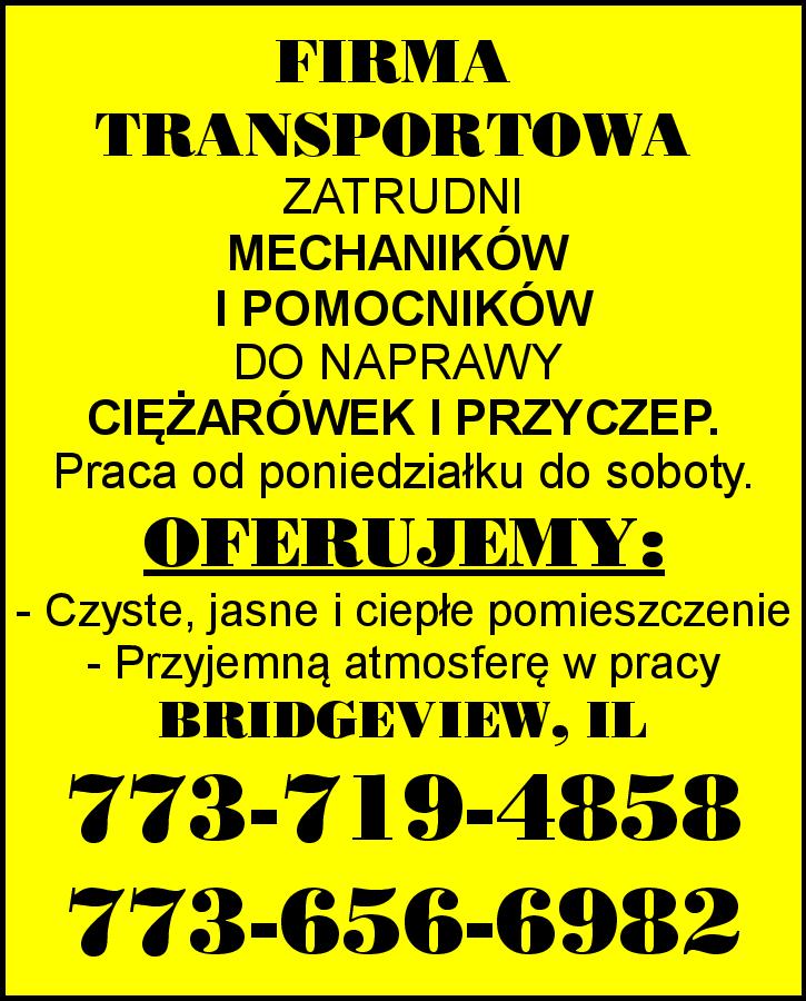 FIRMA TRANSPORTOWA ZATRUDNI MECHANIKÓW I POMOCNIKÓW DO NAPRAWY CIĘŻARÓWEK I PRZYCZEP. Praca od poniedziałku do soboty. OFERUJEMY: - Czyste, jasne i ciepłe pomieszczenie - Przyjemną atmosferę w pracy BRIDGEVIEW, IL 773-719-4858 773-656-6982