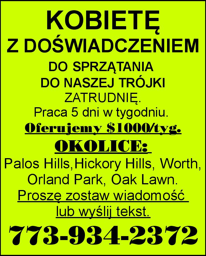 KOBIETĘ Z DOŚWIADCZENIEM DO SPRZĄTANIA DO NASZEJ TRÓJKI ZATRUDNIĘ. Praca 5 dni w tygodniu. Oferujemy $100/tyg. OKOLICE: Palos Hills, Hickory Hills, Worth, Orland Park, Oak Lawn. Proszę zostaw wiadomość lub wyślij tekst. 773-934-2372