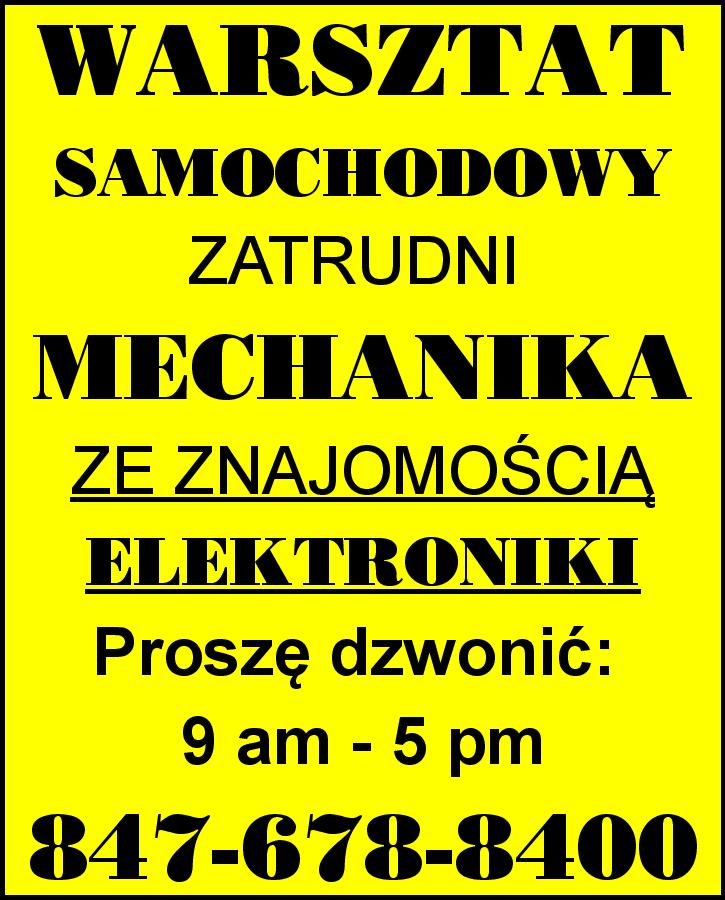 WARSZTAT SAMOCHODOWY ZATRUDNI MECHANIKA ZE ZNAJOMOŚCIĄ ELEKTRONIKI. Proszę dzwonić: 9 am - 5 pm. 847-678-8400