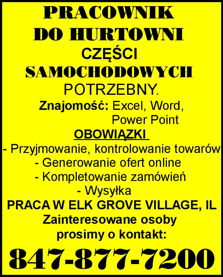 PRACOWNIK DO HURTOWNI CZĘŚCI SAMOCHODOWYCH POTRZEBNY. WYMAGANIA: - Znajomość Excel, Word, Power Point OBOWIĄZKI - Przyjmowanie oraz kontrolowanie towarów - Generowanie ofert online - Kompletowanie zamówień - Wysyłka PRACA W ELK GROVE VILLAGE, IL Zainteresowane osoby prosimy o kontakt: […]