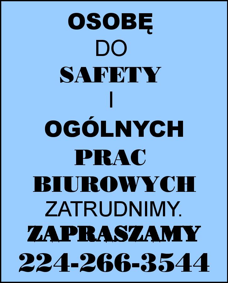 OSOBĘ DO SAFETY I OGÓLNYCH PRAC BIUROWYCH ZATRUDNIMY. ZAPRASZAMY. 224-266-3544