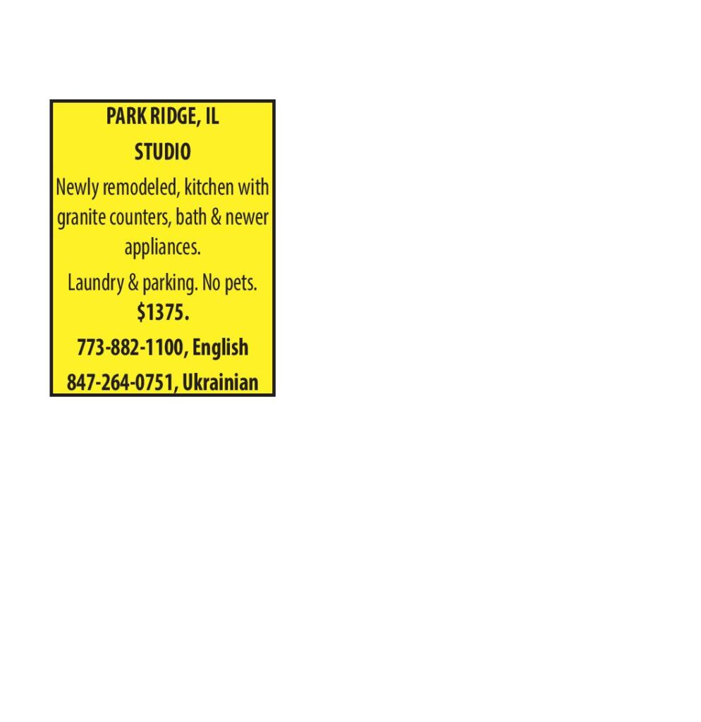 PARK RIDGE, IL STUDIO Newly remodeled, kitchen with granite counters, bath & newer appliances. Laundry & parking. No pets. $1375. 773-882-1100, English 847-264-0751, Ukrainian