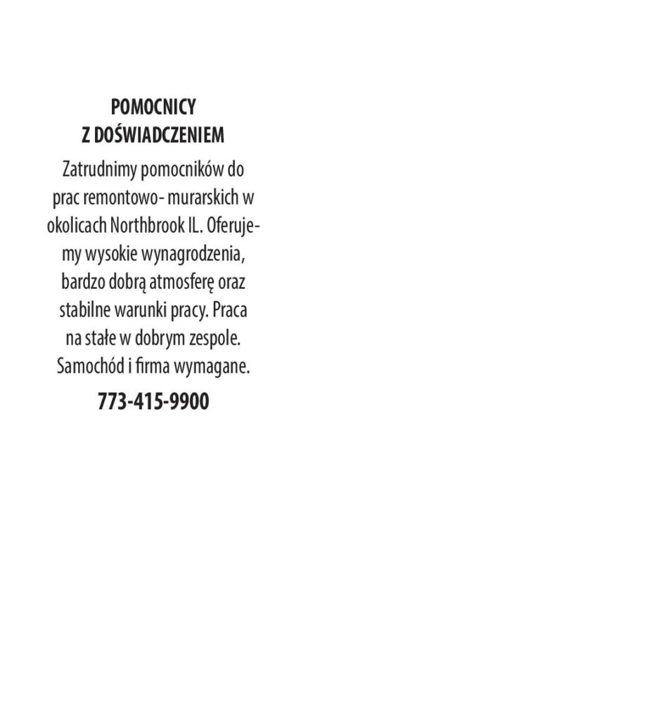 Doświadczony pracownik potrzebny. Północ Chicago. 773-966-1111