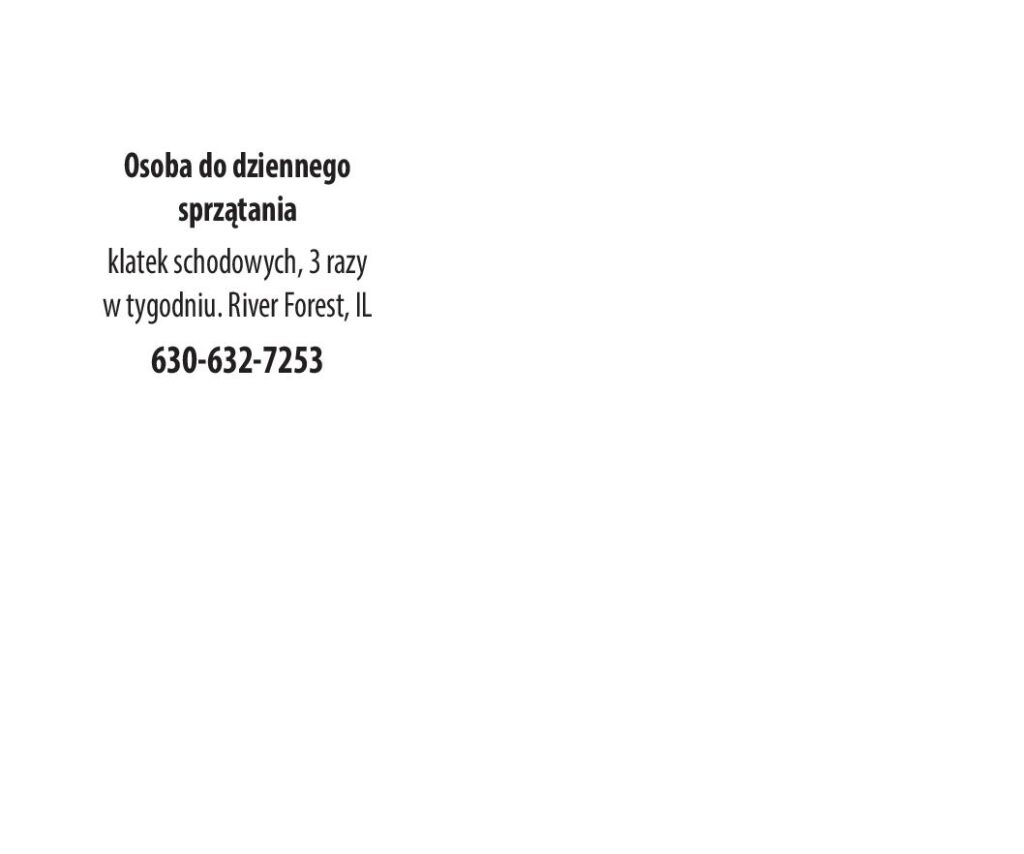 PRACOWNICY do wieczornego sprzątania potrzebni od pon. do piątku (3 godz. dziennie). $20/godz. EAST AURORA, IL 630-669-9004