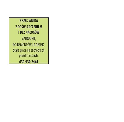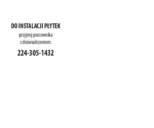 PRACOWNIKA DO REMONTÓW WNĘTRZ I PŁYTKARZA z doświadczeniem przyjmę. Samochód i firma wymagane. Północne przedmieścia. 773-474-8953, wiad.