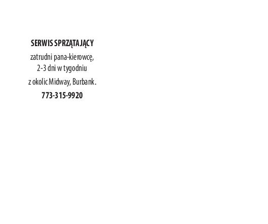 SERWIS SPRZĄTAJĄCY zatrudni pana-kierowcę, 2-3 dni w tygodniu z okolic Midway, Burbank. 773-315-9920