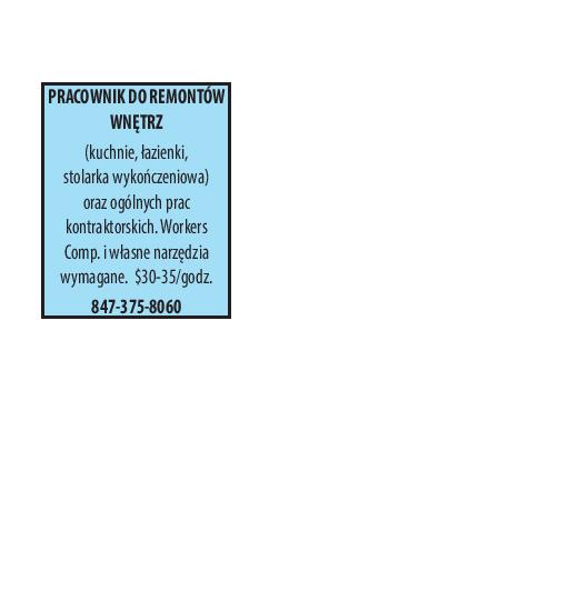 PRACOWNIK DO REMONTÓW WNĘTRZ (kuchnie, łazienki, stolarka wykończeniowa) oraz ogólnych prac kontraktorskich. Workers Comp. i własne narzędzia wymagane. $30-35/godz. 847-375-8060