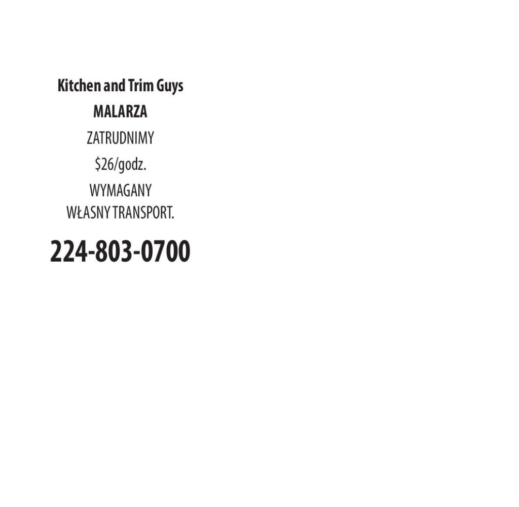 Kitchen and Trim Guys MALARZA ZATRUDNIMY. $26/godz. WYMAGANY WŁASNY TRANSPORT. 224-803-0700