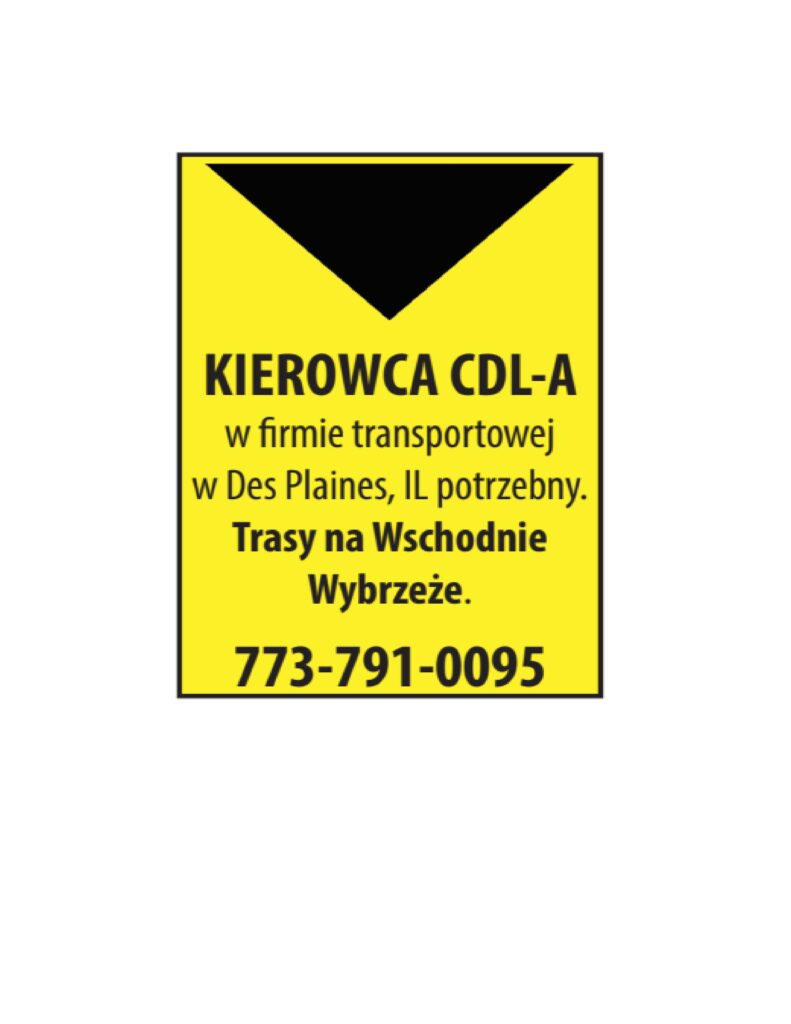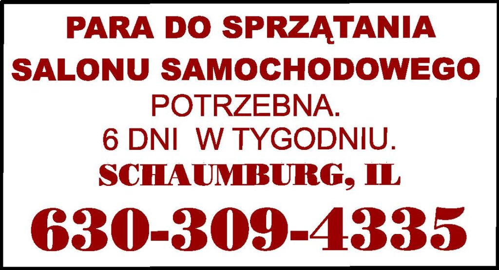 Fabryka produkcyjna w Norridge poszukuje OSOBY DO OGÓLNEJ PRACY FABRYCZNEJ sprzątanie biur, hal produkcyjnych. Praca na pełny etat. Pozwolenie na pracę wymagane. Oferujemy pełne ubezpieczenie dentystyczne, medyczne, plan 401k, płatne świeta i dni chorobowe. Prosze zglaszać sie osobiście A […]