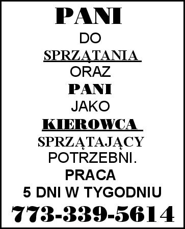 PANI DO SPRZĄTANIA ORAZ PANI JAKO KIEROWCA SPRZĄTAJĄCY - POTRZEBNI. PRACA 5 DNI W TYGODNIU. 773-339-5614