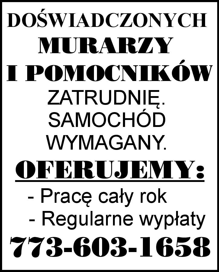 DOŚWIADCZONYCH MURARZY I POMOCNIKÓW ZATRUDNIĘ. SAMOCHÓD WYMAGANY. OFERUJEMY: - Pracę cały rok - Regularne wypłaty 773-603-1658