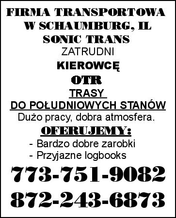 FIRMA TRANSPORTOWA SONIC TRANS W SCHAUMBURG, IL ZATRUDNI KIEROWCĘ OTR TRASY DO POŁUDNIOWYCH STANÓW. Dużo pracy, dobra atmosfera. OFERUJEMY: - Bardzo dobre zarobki - Przyjazne logbooks 773-751-9082 872-243-6873