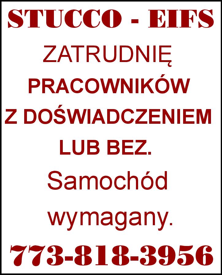 STUCCO - EIFS ZATRUDNIĘ PRACOWNIKÓW Z DOŚWIADCZENIEM LUB BEZ. OD ZARAZ. Samochód wymagany. 773-818-3956