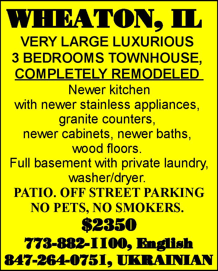 WHEATON, IL VERY LARGE LUXURIOUS 3 BEDROOMS TOWNHOUSE, COMPLETELY REMODELED. Newer kitchen with newer stainless appliances, granite counters, newer cabinets, newer baths, wood floors. Full basement with private laundry, washer/dryer. PATIO. OFF STREET PARKING NO PETS, NO SMOKERS. $235 […]