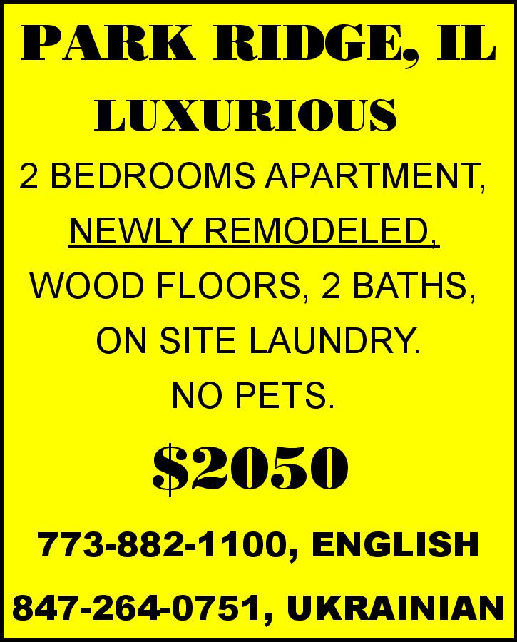 PARK RIDGE, IL LUXURIOUS 2 BEDROOMS APARTMENT, NEWLY REMODELED, WOOD FLOORS, 2 BATHS, ON SITE LAUNDRY. NO PETS. $2050. 773-882-1100, ENGLISH 847-264-0751, UKRAINIAN