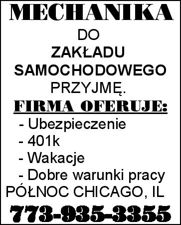 MECHANIK SAMOCHODÓW CIĘŻAROWYCH (DIESEL), POTRZEBNY. NARZĘDZIA NIEWYMAGANE. Minimum $25-35/godz. (gotówką), w zależności od umiejętności. GLENVIEW, IL Dzwoń lub wyślij SMS. 773-372-2623