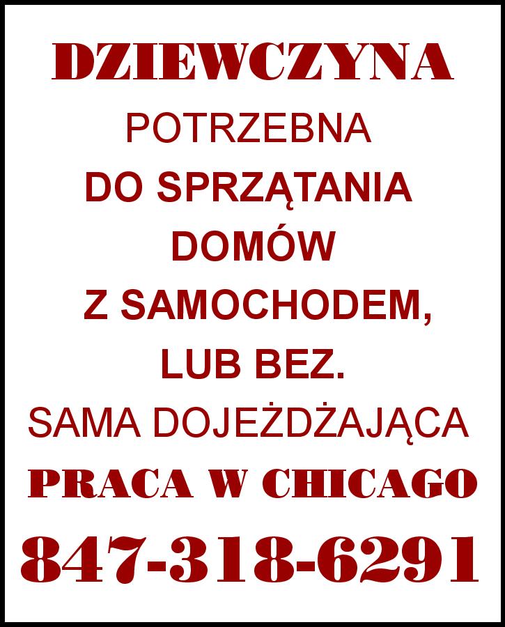 DZIEWCZYNA POTRZEBNA DO SPRZĄTANIA DOMÓW Z SAMOCHODEM, LUB BEZ. SAMA DOJEŻDŻAJĄCA. PRACA W CHICAGO. 847-318-6291