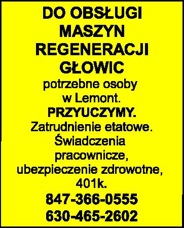 potrzebne osoby w Lemont. Zatrudnienie etatowe. Świadczenia pracownicze, ubezpieczenie zdrowotne, 401k. 847-366-0555, 630-465-2602