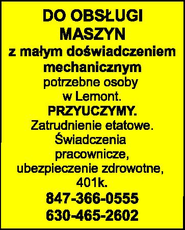 z małym doświadczeniem mechanicznym potrzebne osoby w Lemont. PRZYUCZYMY. Zatrudnienie etatowe. Świadczenia pracownicze, ubezpieczenie zdrowotne, 401k. 847-366-0555, 630-465-2602