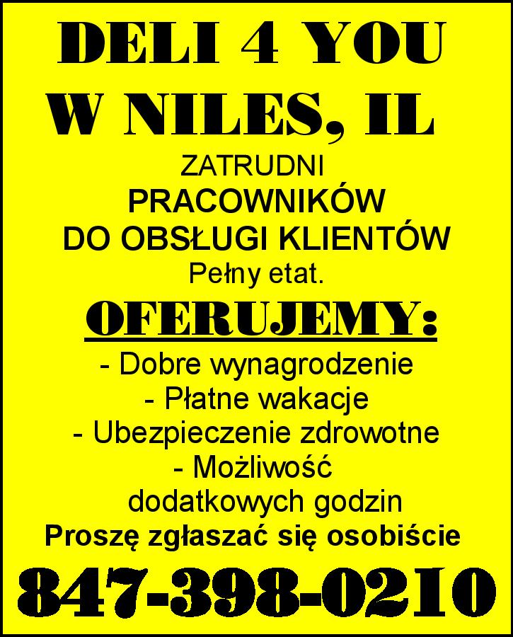 DELI 4 YOU W SCHAUMBURG, IL ZATRUDNI PRACOWNIKÓW DO OBSŁUGI KLIENTÓW. Pełny lub pół etatu. OFERUJEMY: - Dobre wynagrodzenie - Płatne wakacje - Ubezpieczenie zdrowotne - Możliwość dodatkowych godzin Proszę zgłaszać się osobiście. 847-312-7070