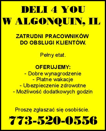 DELI 4 YOU W ALGONQUIN, IL ZATRUDNI PRACOWNIKÓW DO OBSŁUGI KLIENTÓW. Pełny etat. OFERUJEMY: - Dobre wynagrodzenie - Płatne wakacje - Ubezpieczenie zdrowotne - Możliwość dodatkowych godzin Proszę zgłaszać się osobiście. 773-520-0556